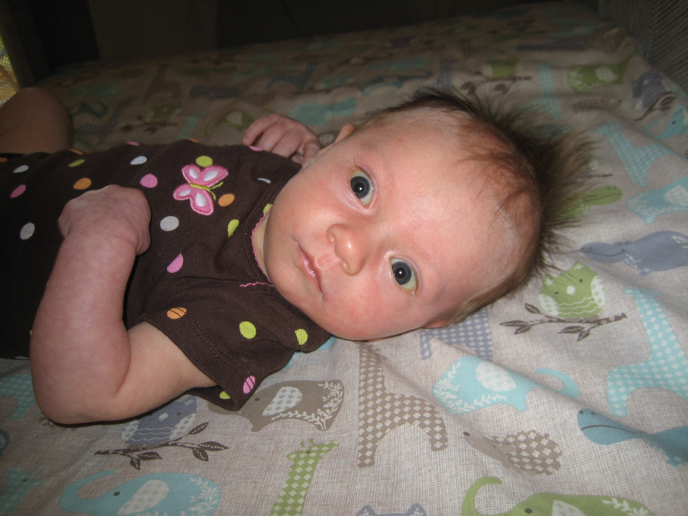 - Everyone seems to love Hailey’s crazy hair. There’s really no way to make it lay down, which is fine by me since her daily spikes and faux-hawks are very becoming. The only problem with the hair is that Hailey is reflexively grasping regularly, and with her constant squirm-worming, she sometimes grasps a whole handful of her do. The poor thing has never screamed louder than when she is pulling her own hair. She doesn’t realize that all she has to do is let go.