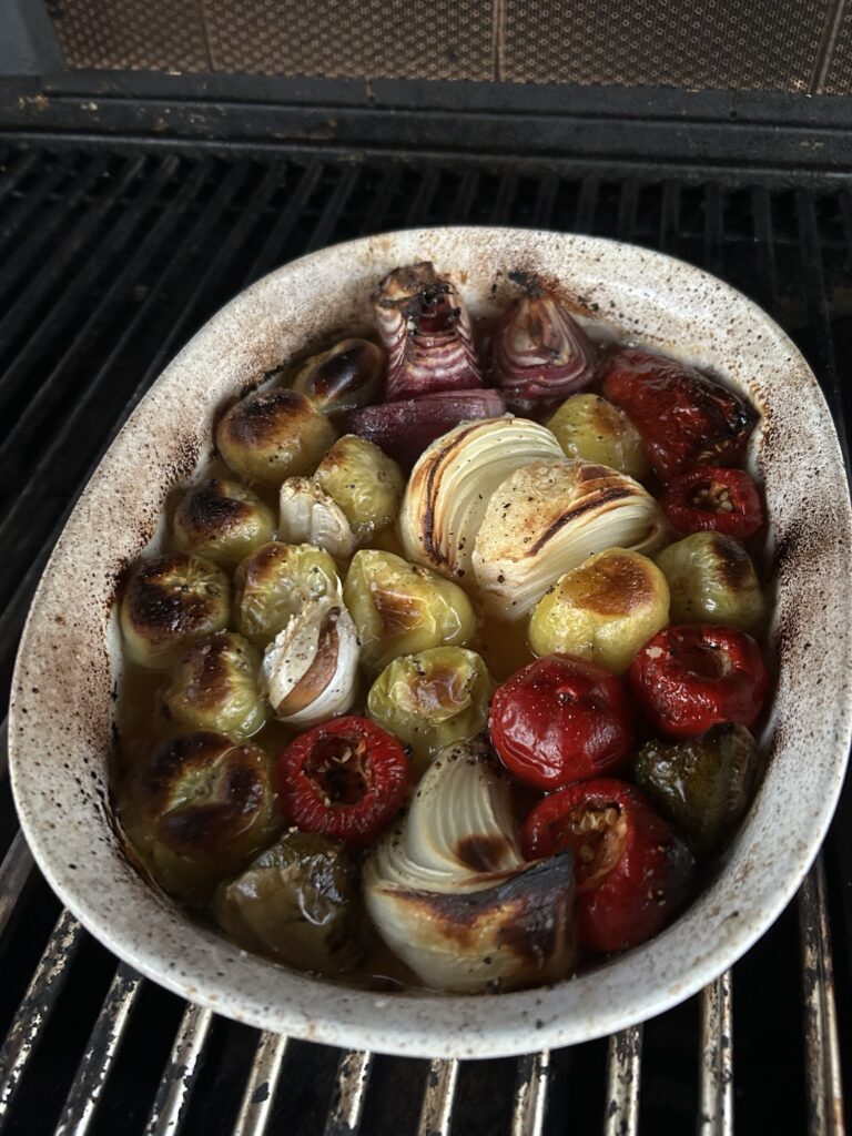 Roast everything up to the olive oil. I did it on the grill, but in the oven it would be roughly 20 minutes at 425F for about 20 minutes. If you’re doing on the grill, run the grill on high and roast it until you smell everything being very fragrant and you can see charring on the edges of all the vegetables.
